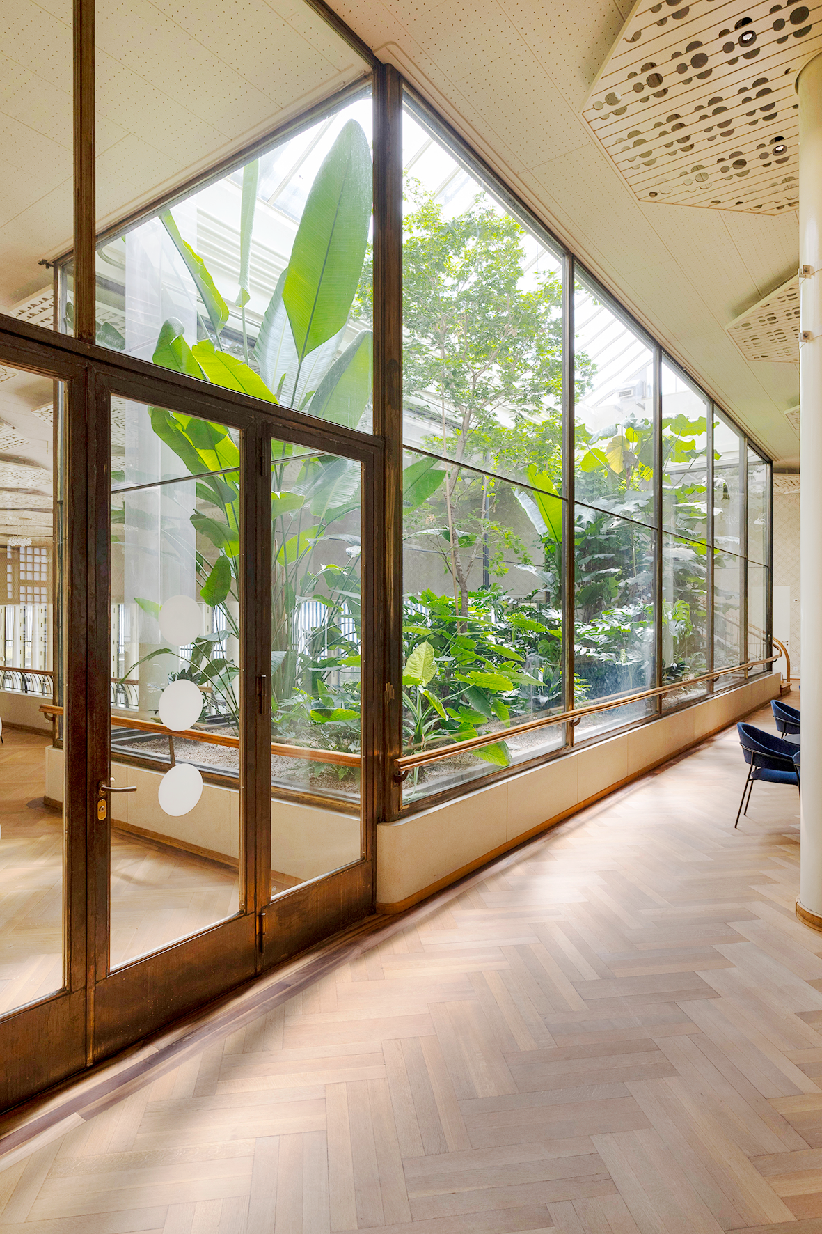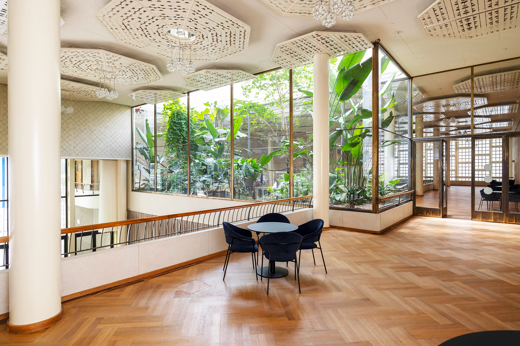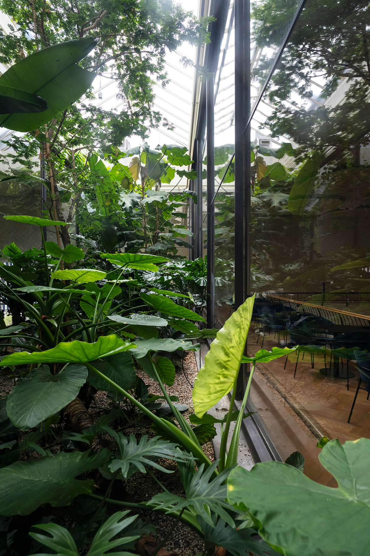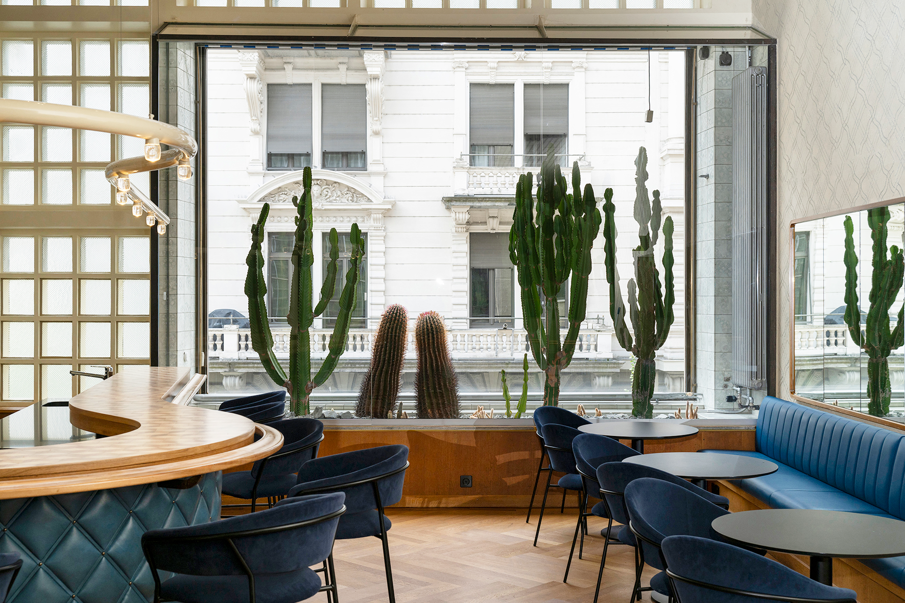 Die Verflechtung von Architektur und Natur war ein zentraler Punkt und wichtiges Gestaltungselement: Frische Bepflanzungen setzen den Gartenhof, den Wintergarten und das Blumenfenster bei der Bar in Szene. Die Vegetationsfenster eröffnen den Blick in eine Art südamerikanischen Dschungel.